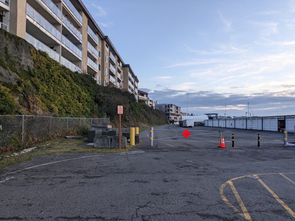 Now look south. That area under South Shores Condo heading down to the road would be the Marina Steps.Past that about where the gate is which divides the road, the City has proposed building an Adaptive Purpose Building to house the Harbormaster’s Office, SR3 and boat storage. The boat storage is referred to as ‘Dry Stack’. So, the APB would be big. How big? It would extend south to the edge of CSR Marine.