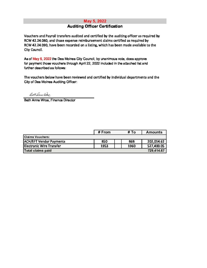 • Zoom: To sign up, call (206) 870-6552  or email cityclerk@desmoineswa.gov the City Clerk by noon Wednesday — the day before the meeting.