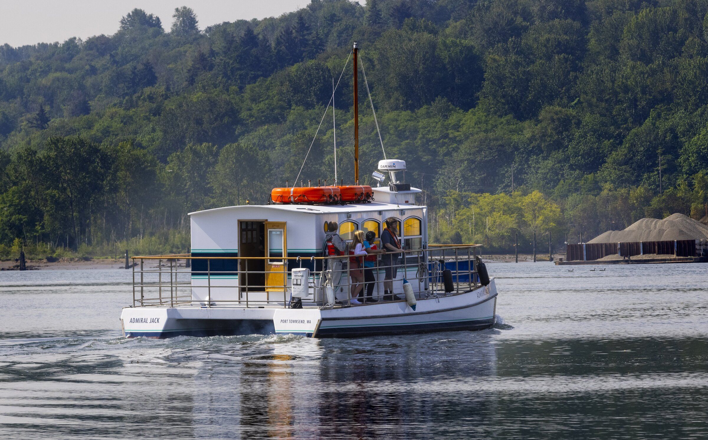 Image shows the Admiral Jack ferry boat operating on water with passengers aboard. The vessel appears to be a passenger ferry with multiple decks and safety equipment visible.