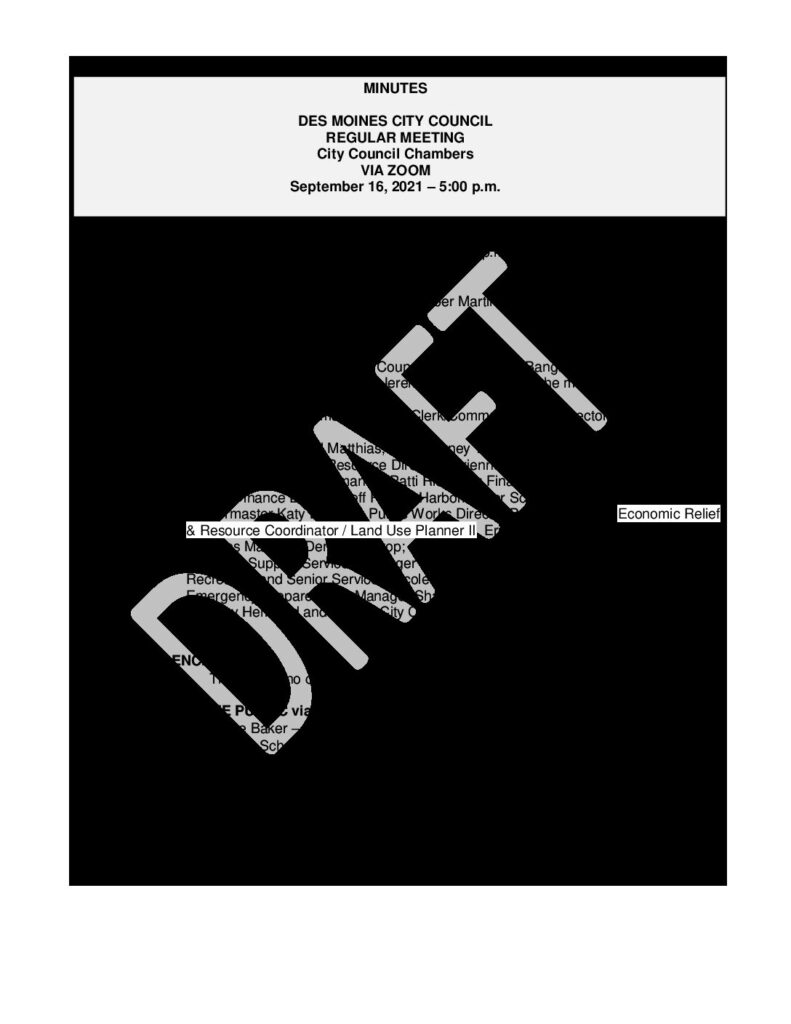 • Zoom: To sign up, call (206) 870-6552  or email cityclerk@desmoineswa.gov the City Clerk by noon Wednesday — the day before the meeting.
