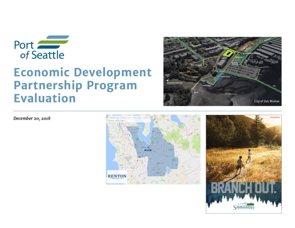 Port of Seattle evaluation of Economic Development Partnership Program from December 2018, featuring primary retail trade areas in Renton, Washington and City of Des Moines. The document includes maps and community development analysis prepared by Community Attributes Inc.