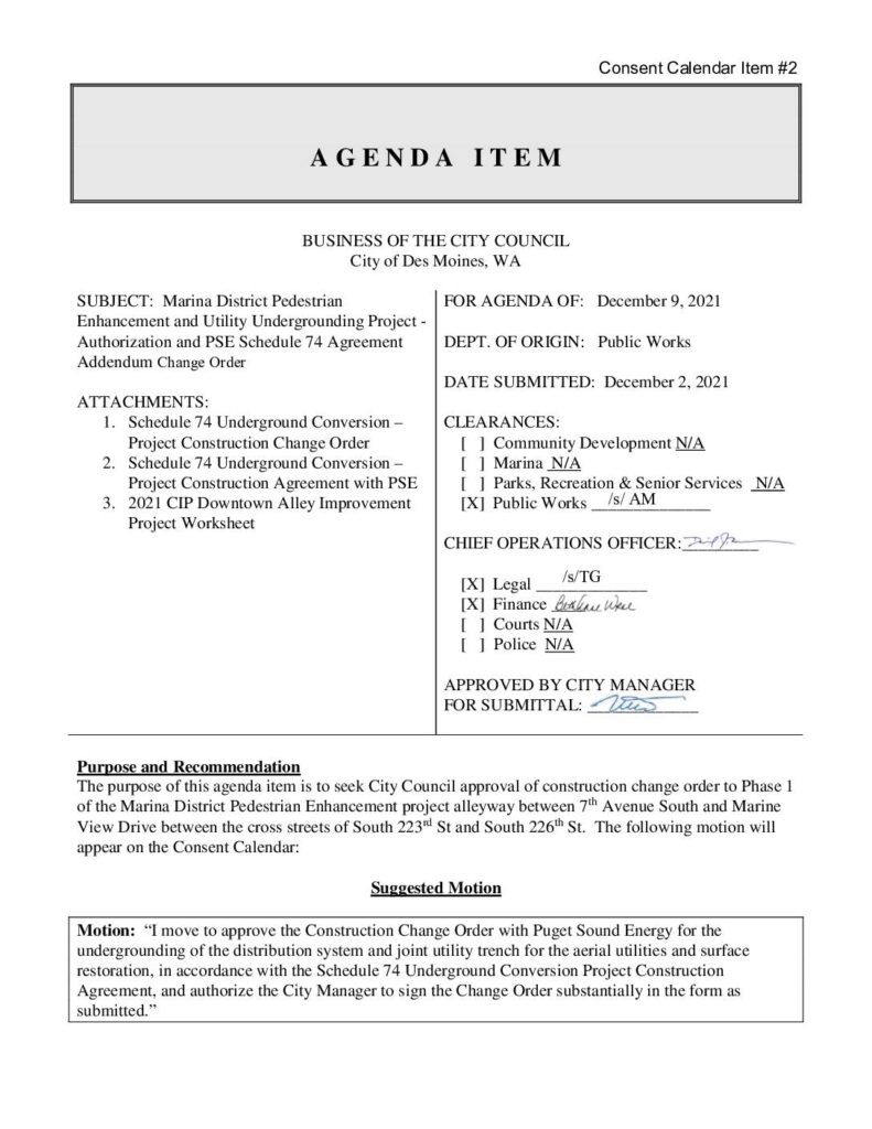 City Council agenda item seeking approval of a construction change order for Phase 1 of the Marina District Pedestrian Enhancement project. The change order involves utility undergrounding work with Puget Sound Energy and adds $163,223 to the project due to construction delays, coordination issues, COVID-19 impacts, and inflationary pressures.