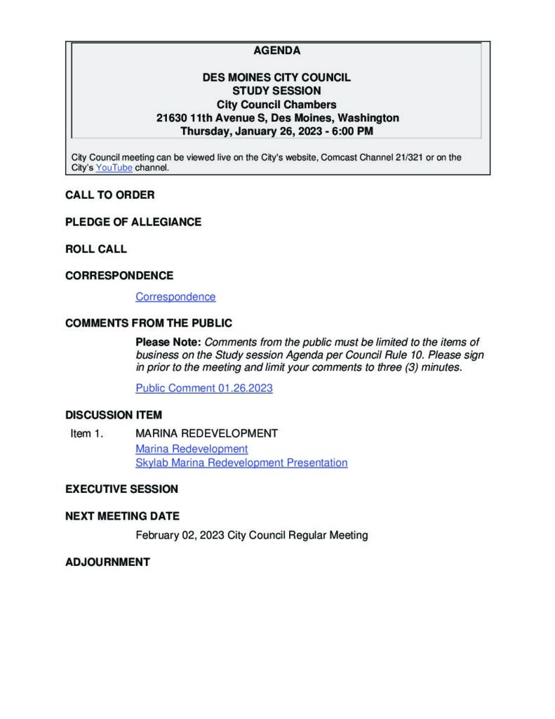 • Zoom: To sign up, call (206) 870-6552  or email cityclerk@desmoineswa.gov the City Clerk by noon Wednesday — the day before the meeting.