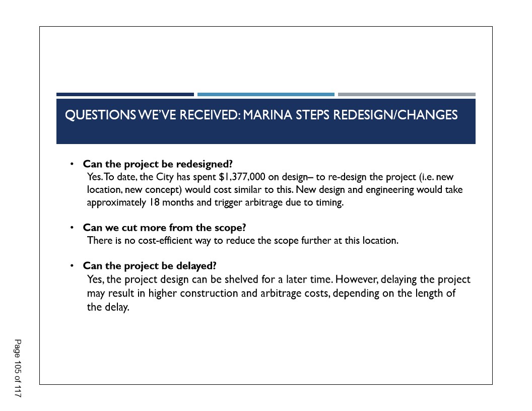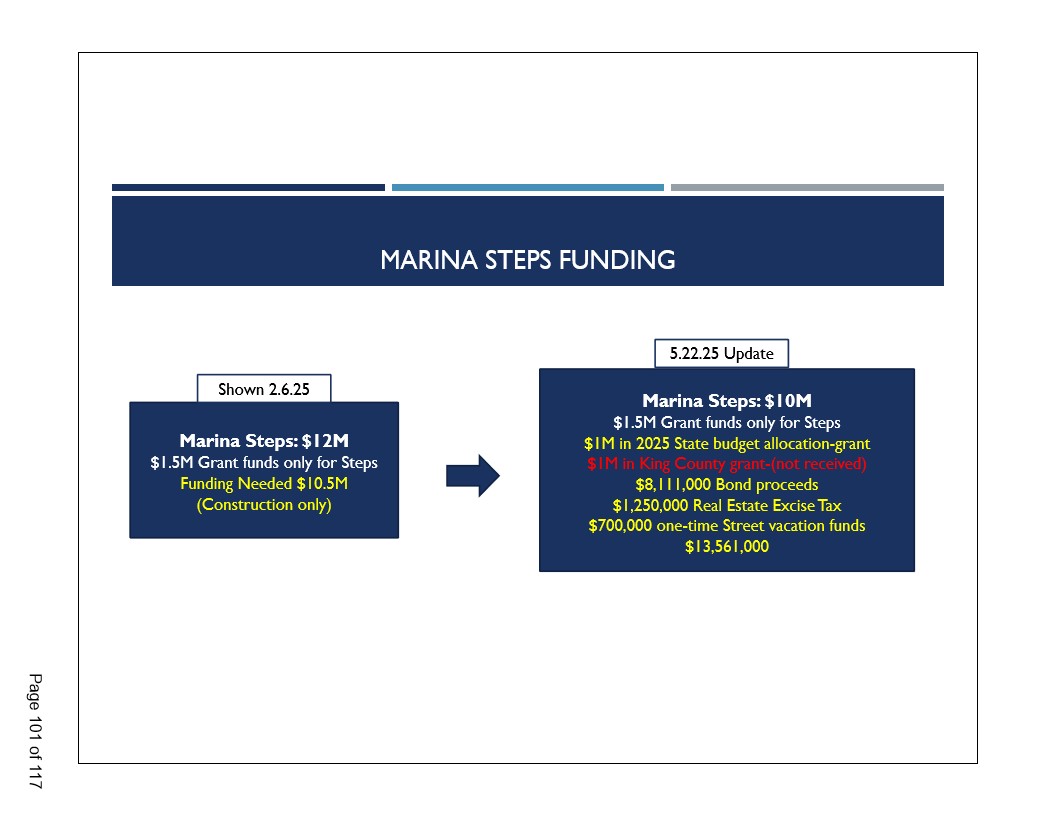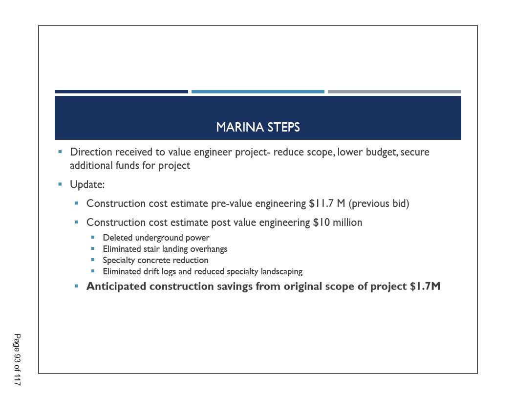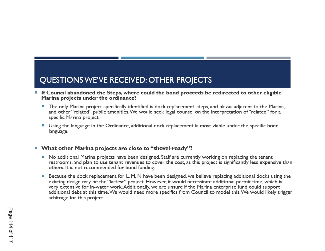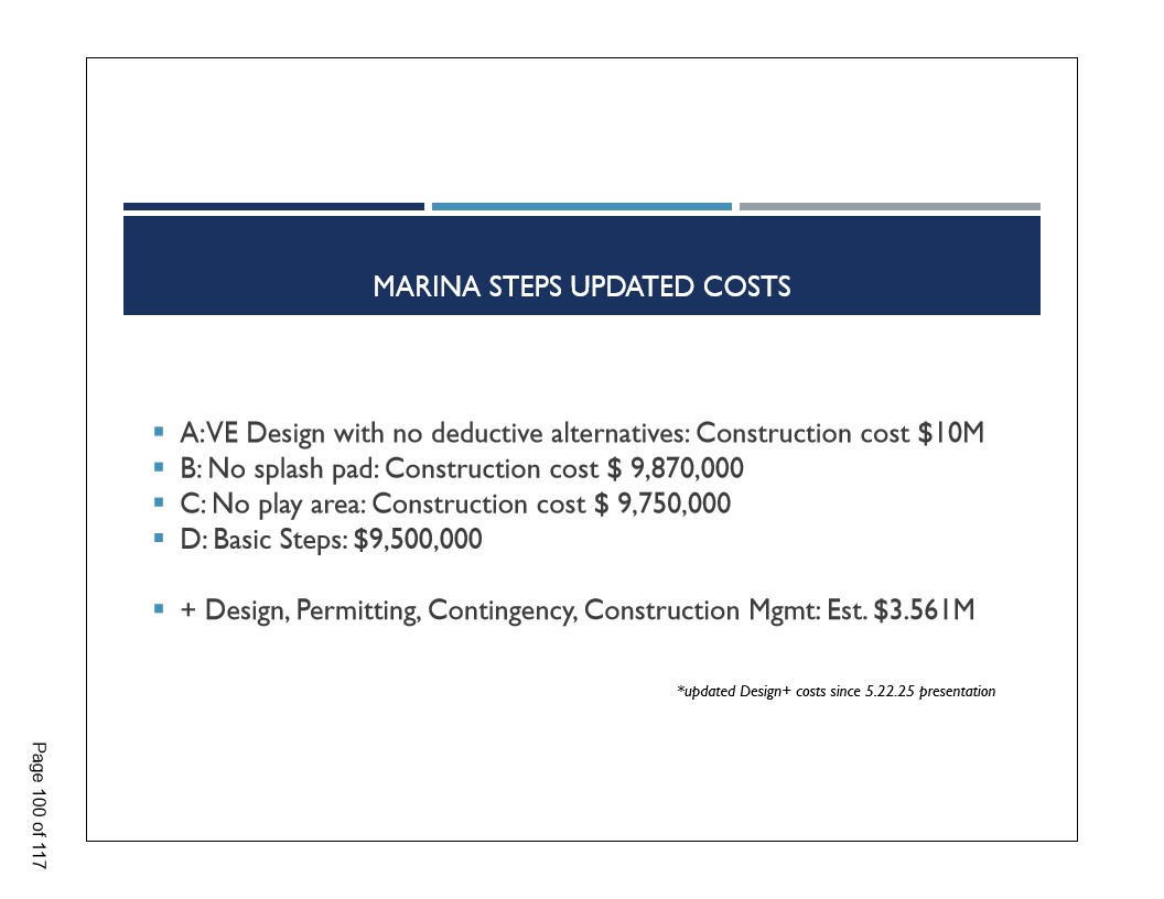 We voted 4-3 to move ahead with Option A of the Marina Steps in order to spend down the remaining money from Bond Ordinance 1773. We are $900,000 short, even with the $100,000 value engineering fee, so we will be taking money from other funds next year such as necessary repairs to the police station.
