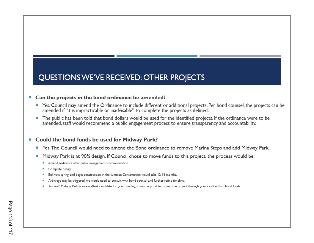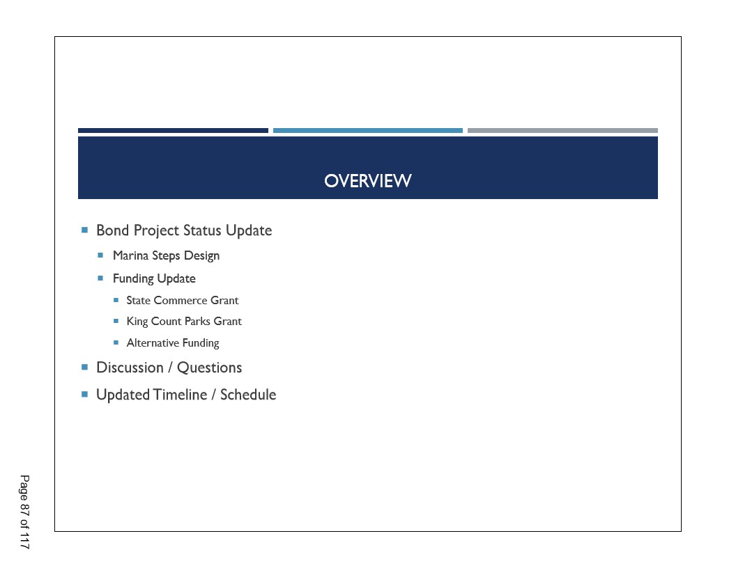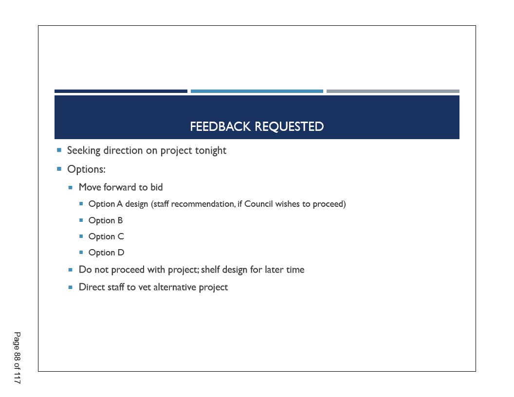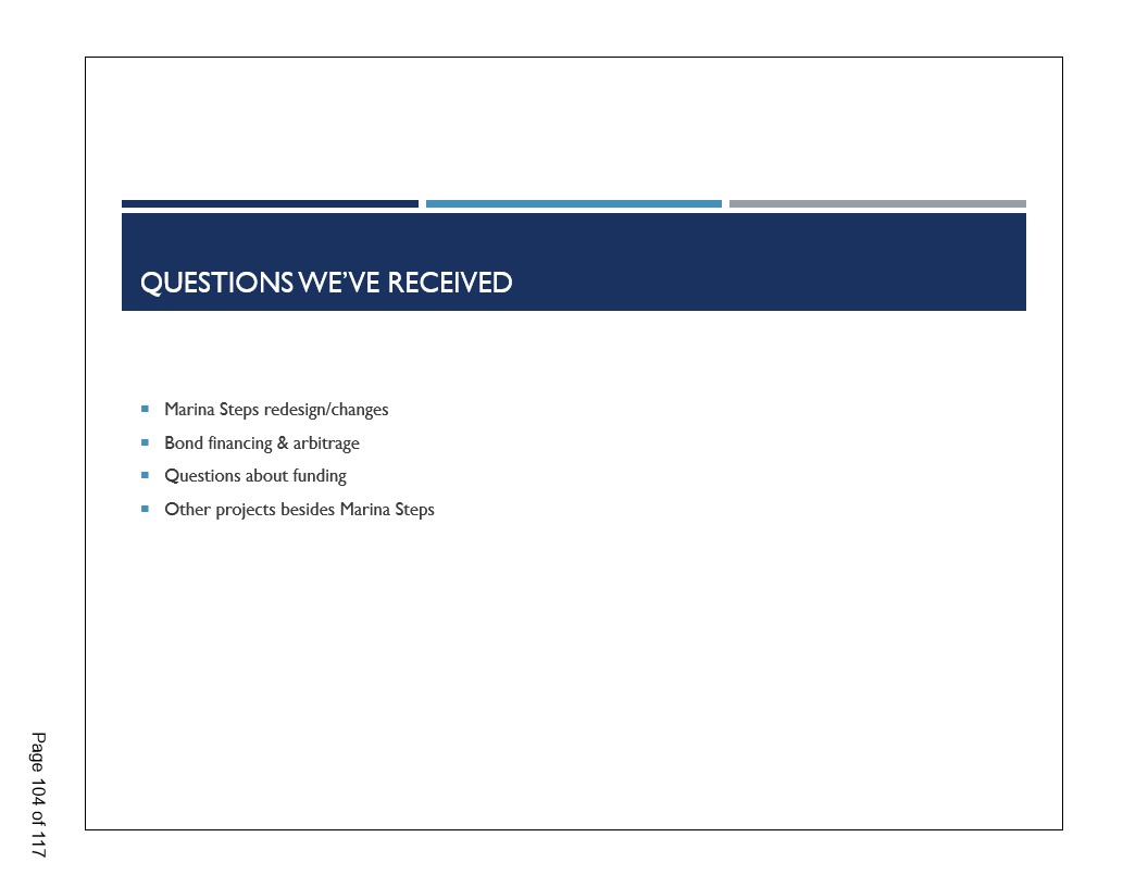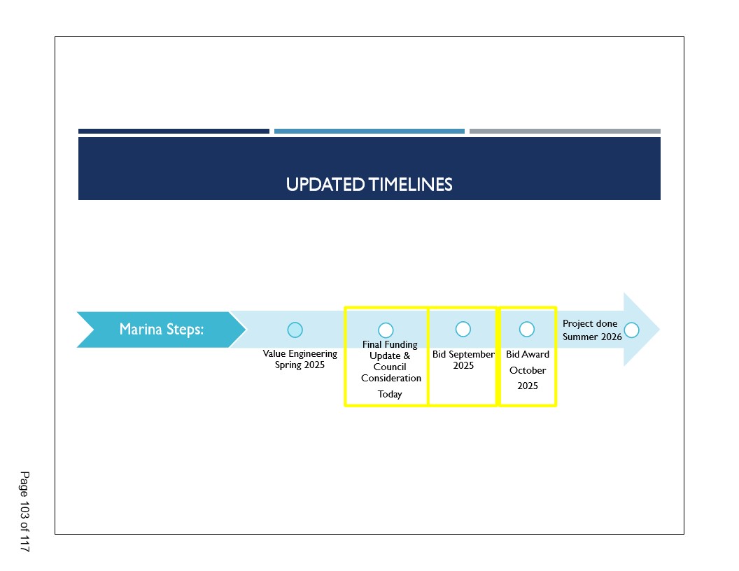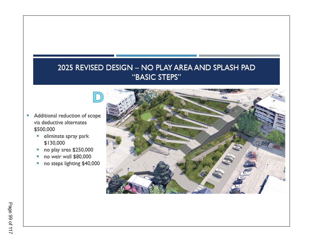 We voted 4-3 to move ahead with Option A of the Marina Steps in order to spend down the remaining money from Bond Ordinance 1773. We are $900,000 short, even with the $100,000 value engineering fee, so we will be taking money from other funds next year such as necessary repairs to the police station.