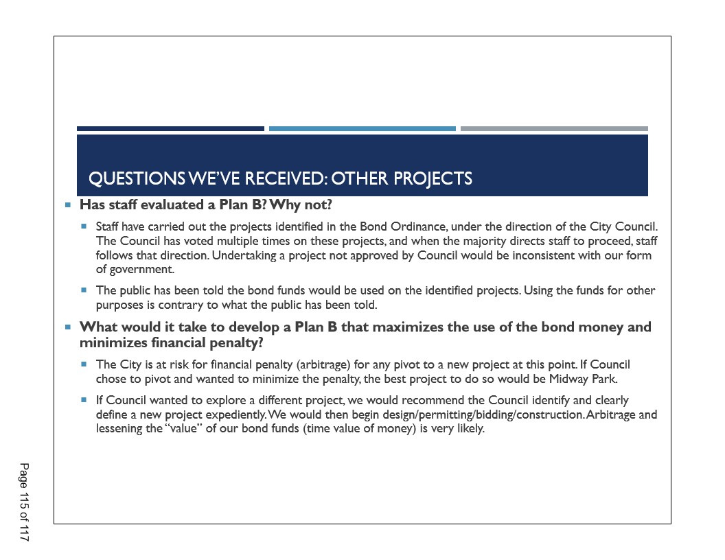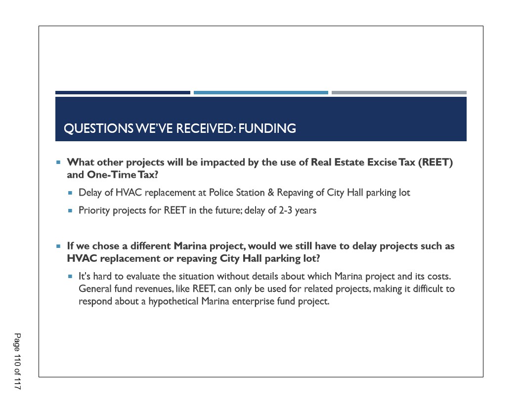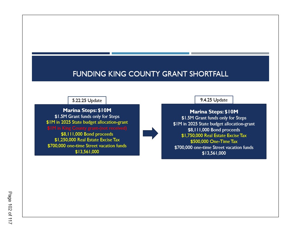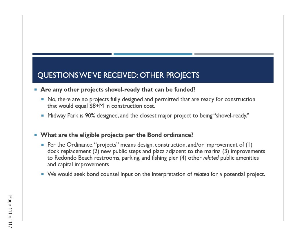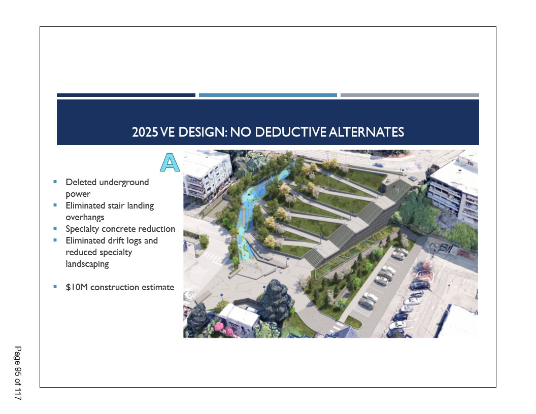 We voted 4-3 to move ahead with Option A of the Marina Steps in order to spend down the remaining money from Bond Ordinance 1773. We are $900,000 short, even with the $100,000 value engineering fee, so we will be taking money from other funds next year such as necessary repairs to the police station.
