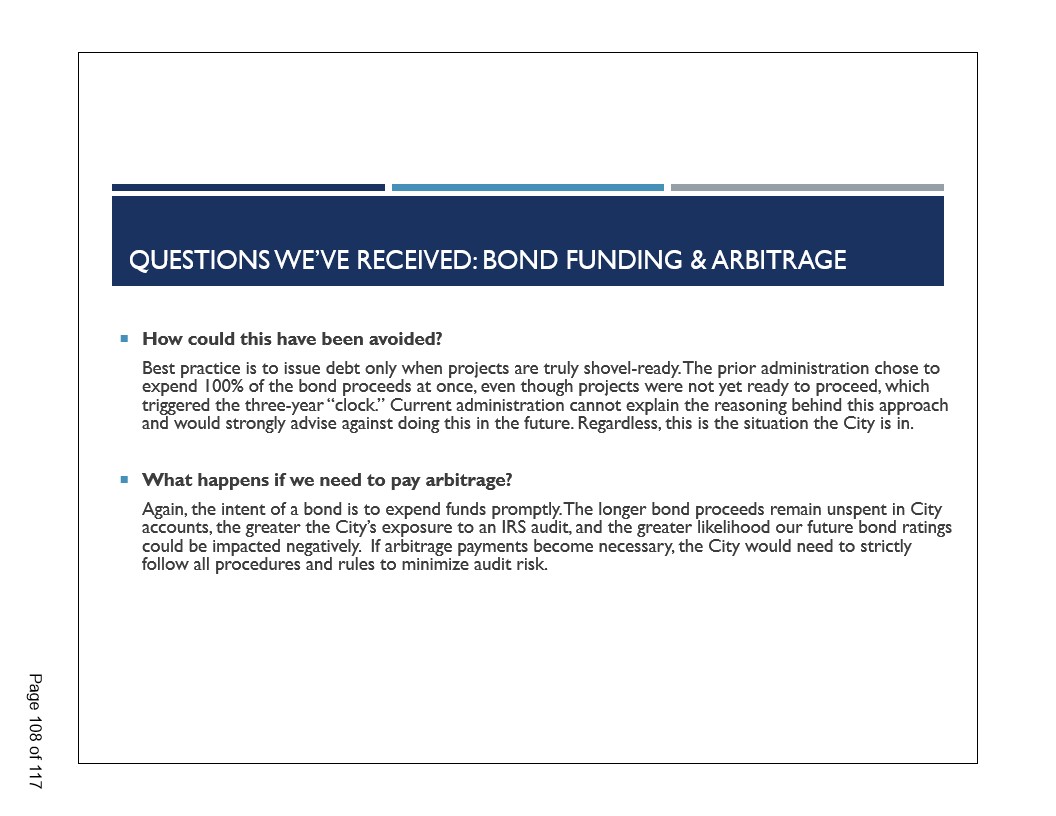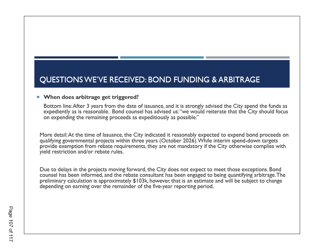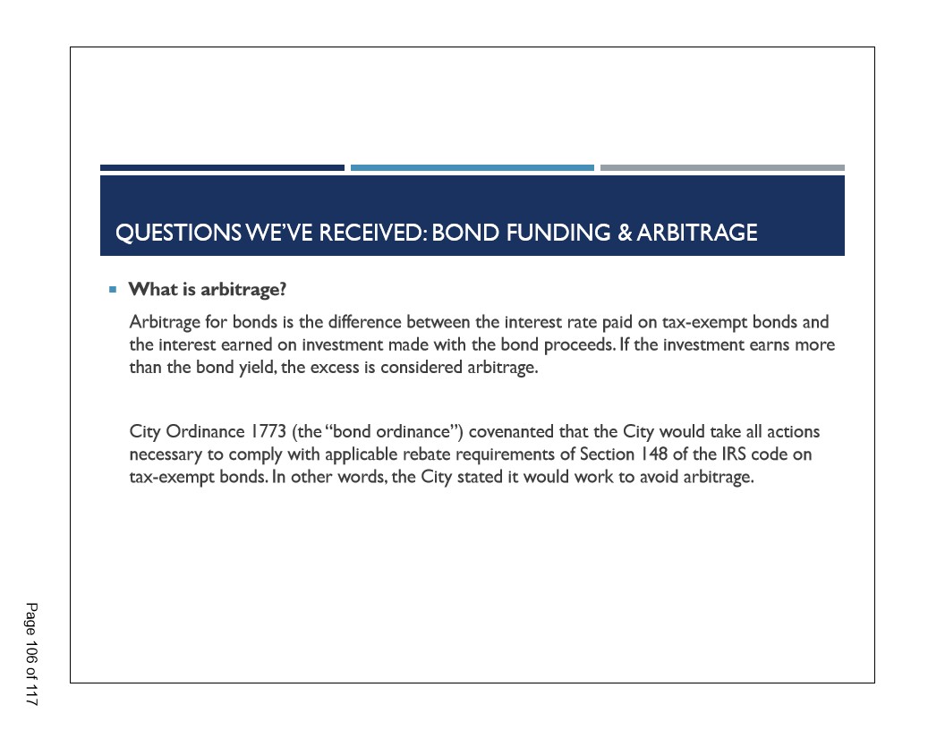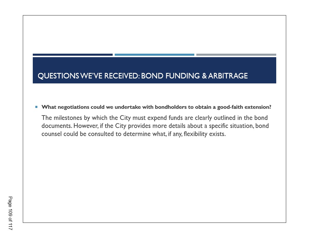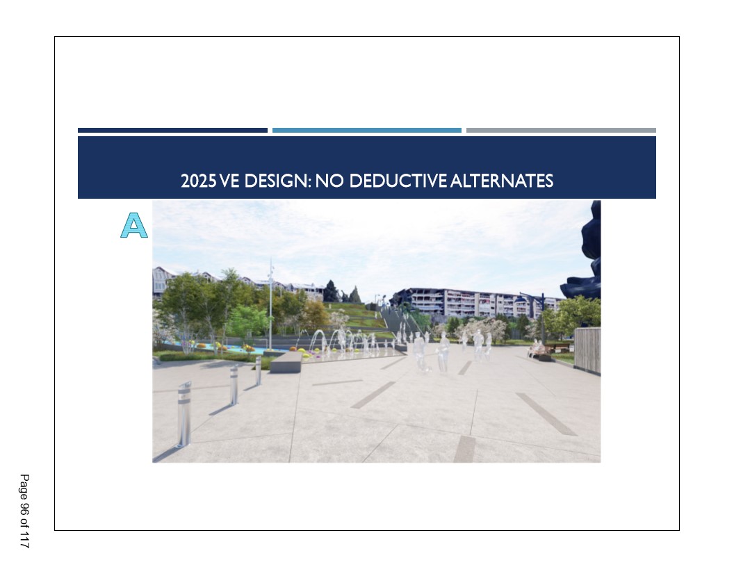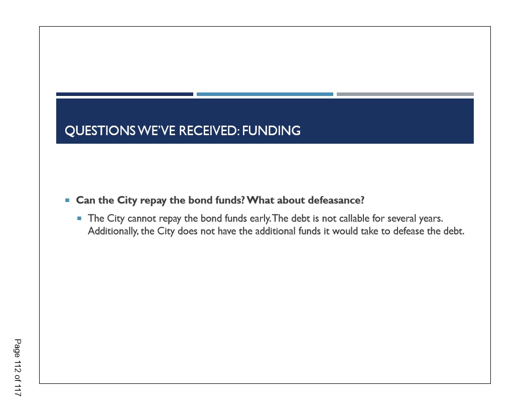 We voted 4-3 to move ahead with Option A of the Marina Steps in order to spend down the remaining money from Bond Ordinance 1773. We are $900,000 short, even with the $100,000 value engineering fee, so we will be taking money from other funds next year such as necessary repairs to the police station.