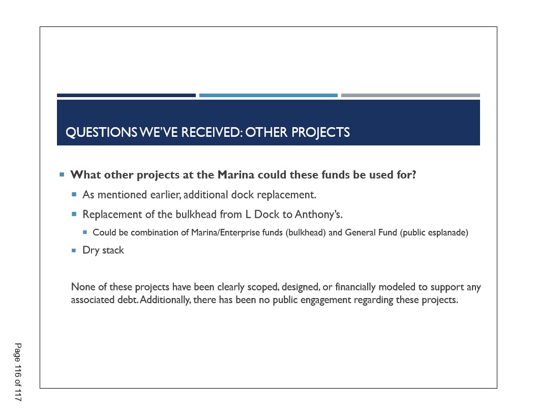 It’s like not having a plan for dealing with the SAMP, and choosing not to develop numbers on a dry stack (or any other capital projects at the Marina) simply because “We don’t know which direction the Council wants to go in.”