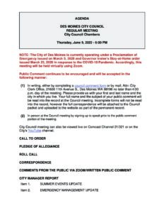 • E-mail: All e-mails sent to citycouncil@desmoineswa.gov are considered public comment. They are instantly available to all members of the City Council and the City Clerk who includes them into the record of public comments at the next meeting.