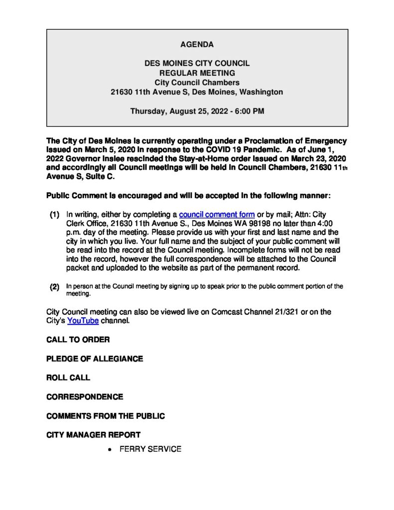 • Zoom: To sign up, call (206) 870-6552  or email cityclerk@desmoineswa.gov the City Clerk by noon Wednesday — the day before the meeting.