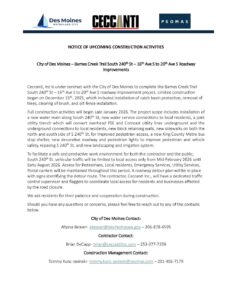 Official notice from the City of Des Moines regarding construction activities for the Barnes Creek Trail South 240th Street roadway improvement project. The project includes water main installation, utility line conversion, new sidewalks, retaining walls, and other infrastructure improvements, with road closures from Mid-February to Early August 2026.