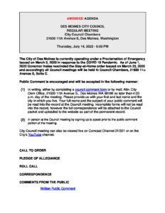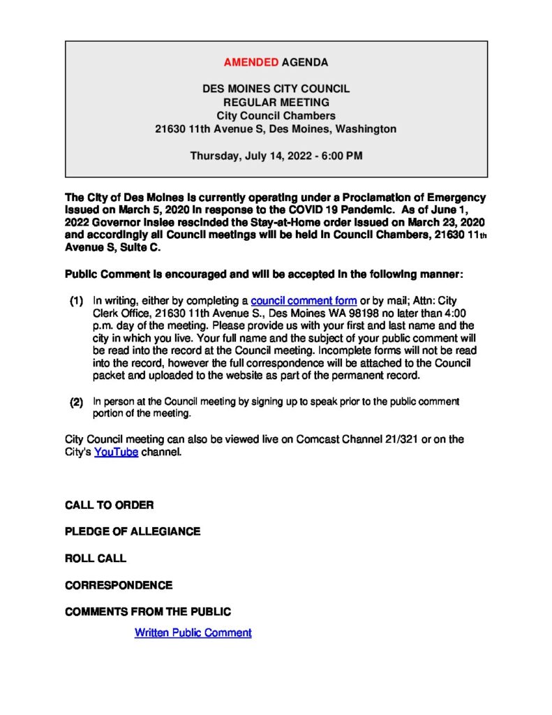 • Zoom: To sign up, call (206) 870-6552  or email cityclerk@desmoineswa.gov the City Clerk by noon Wednesday — the day before the meeting.