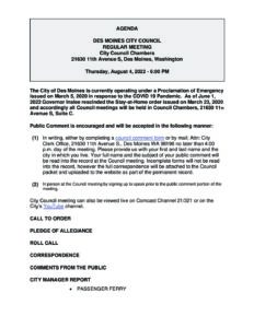 • Zoom: To sign up, call (206) 870-6552  or email cityclerk@desmoineswa.gov the City Clerk by noon Wednesday — the day before the meeting.