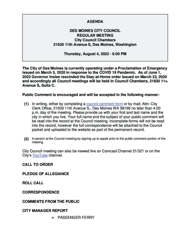 • E-mail: All e-mails sent to citycouncil@desmoineswa.gov are considered public comment. They are instantly available to all members of the City Council and the City Clerk who includes them into the record of public comments at the next meeting.