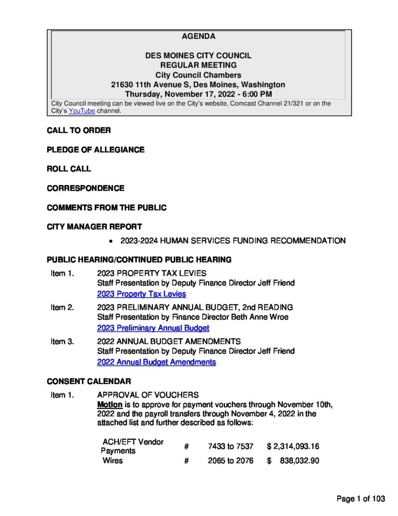 • US Mail: Attn: City Clerk Office, 21630 11th Avenue S., Des Moines WA 98198. Please provide us with your first and last name and the city in which you live.